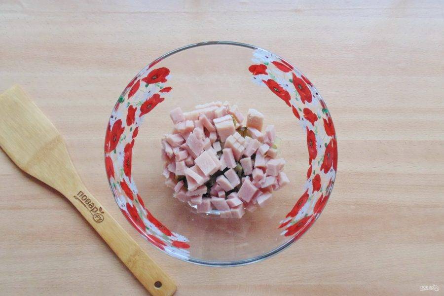 Ветчину нарежьте такими же кубиками, как и огурец.
