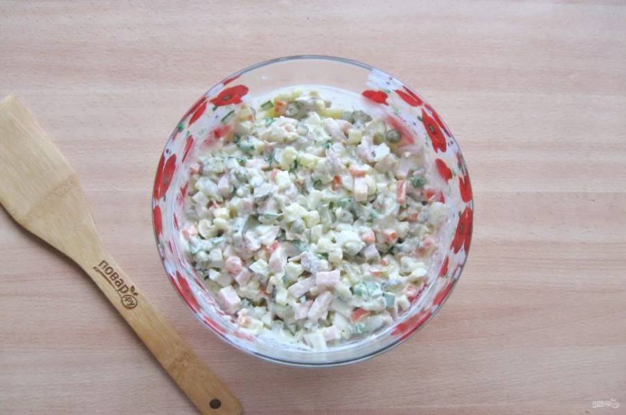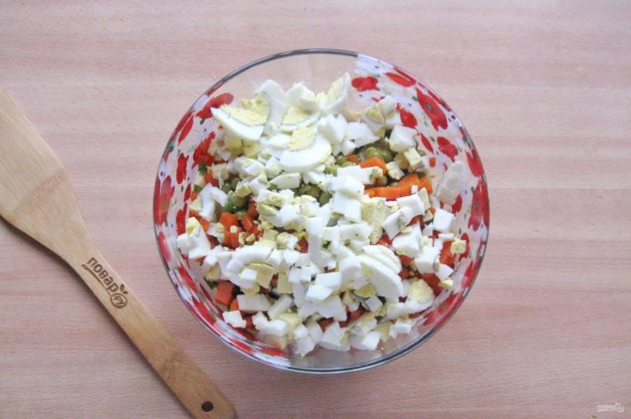 Яйца сварите вкрутую, охладите, очистите. Мелко нарежьте и добавьте в салат.