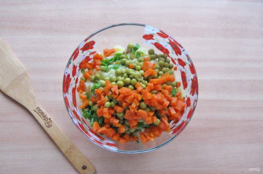 Морковь сварите, охладите и нарежьте картофель.