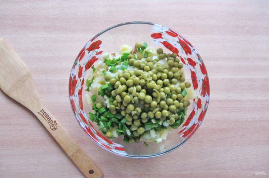 Добавьте консервированный зеленый горошек.