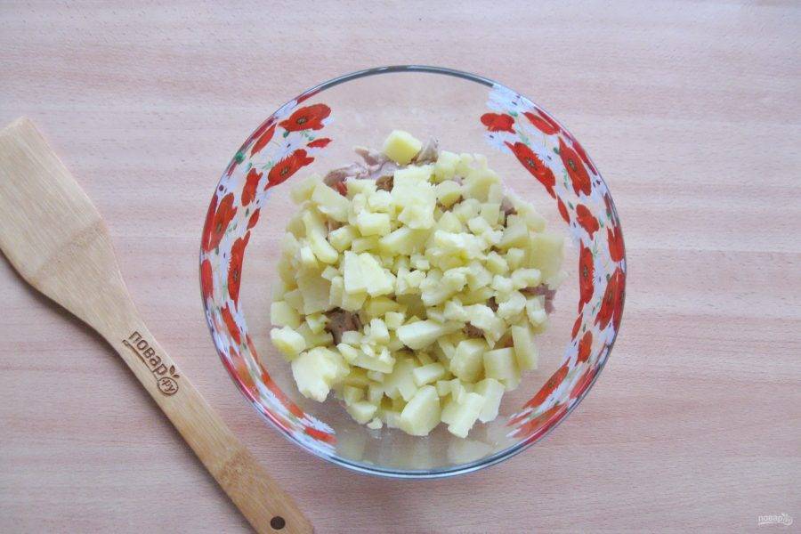 Отварной картофель охладите и нарежьте небольшими кубиками.