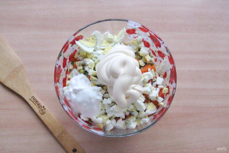 Заправьте салат майонезом и сметаной.
