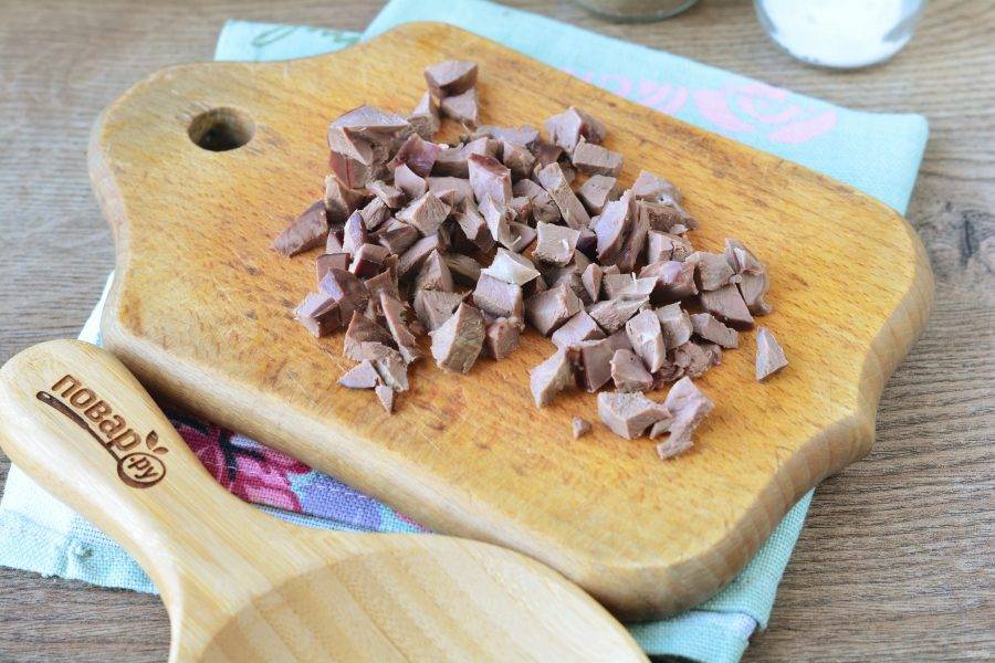 Свиное или говяжье сердце варите 40-50 минут до мягкости, остудите и нарежьте небольшими кубиками.