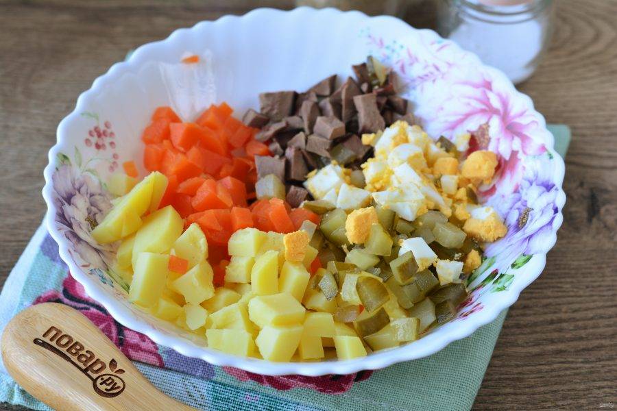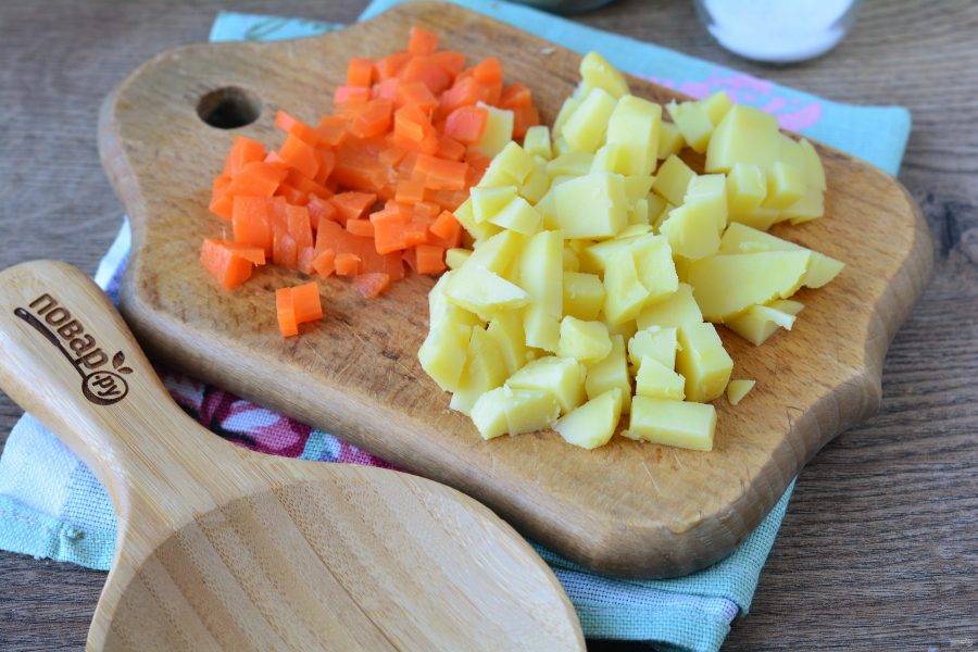 Отварите до мягкости картофель и морковь в мундире, почистите от кожуры, нарежьте кубиками для салата.
