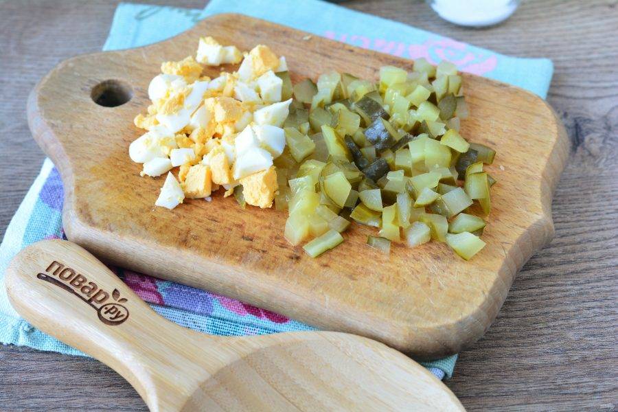 Сварите вкрутую куриные яйца, нарежьте кубиками. Нарежьте кубиками соленые огурцы.