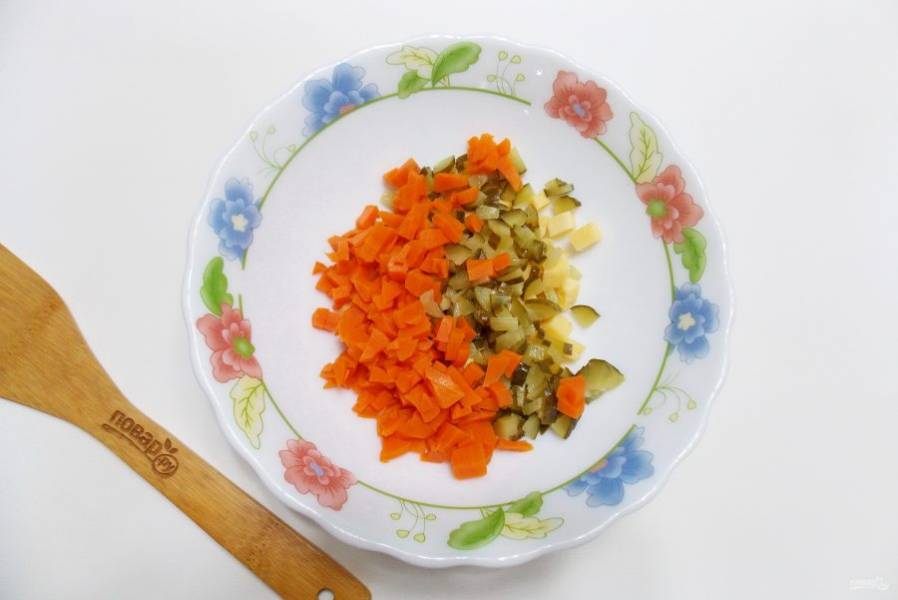 Морковь отварите, охладите, очистите. Нарежьте кубиками морковь и соленый или маринованный огурец.