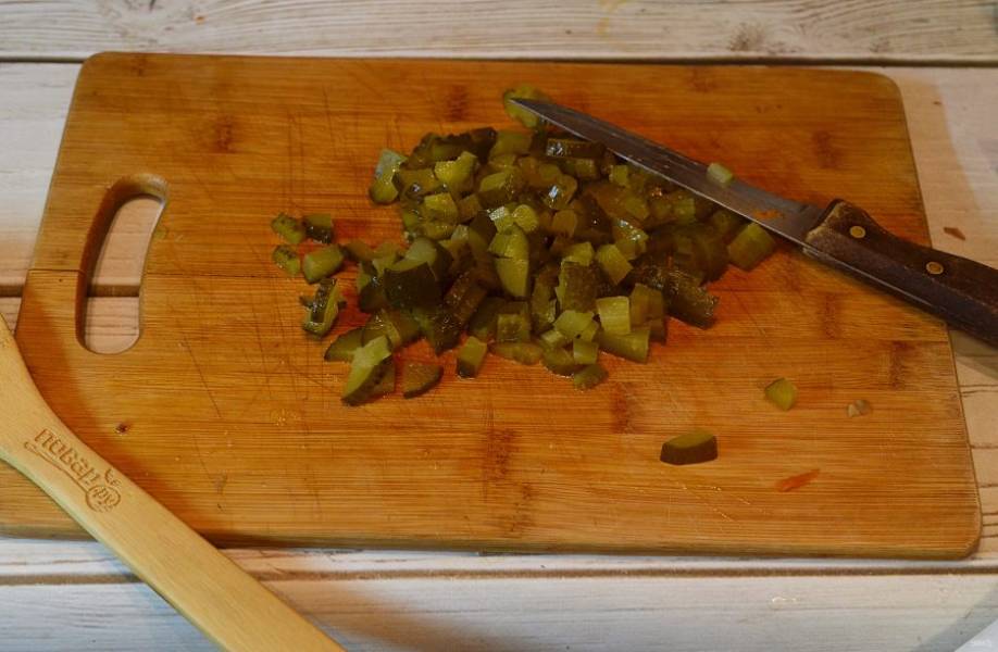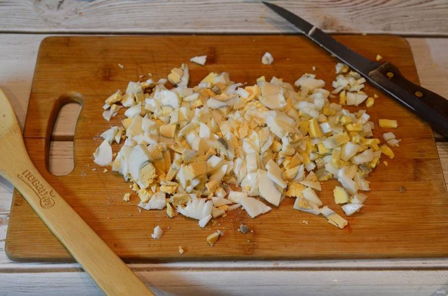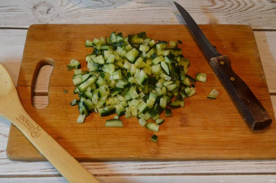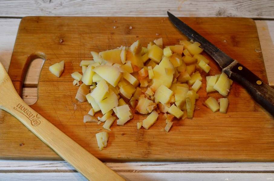 1. Скумбрию отделите от костей и нарежьте кубиком.