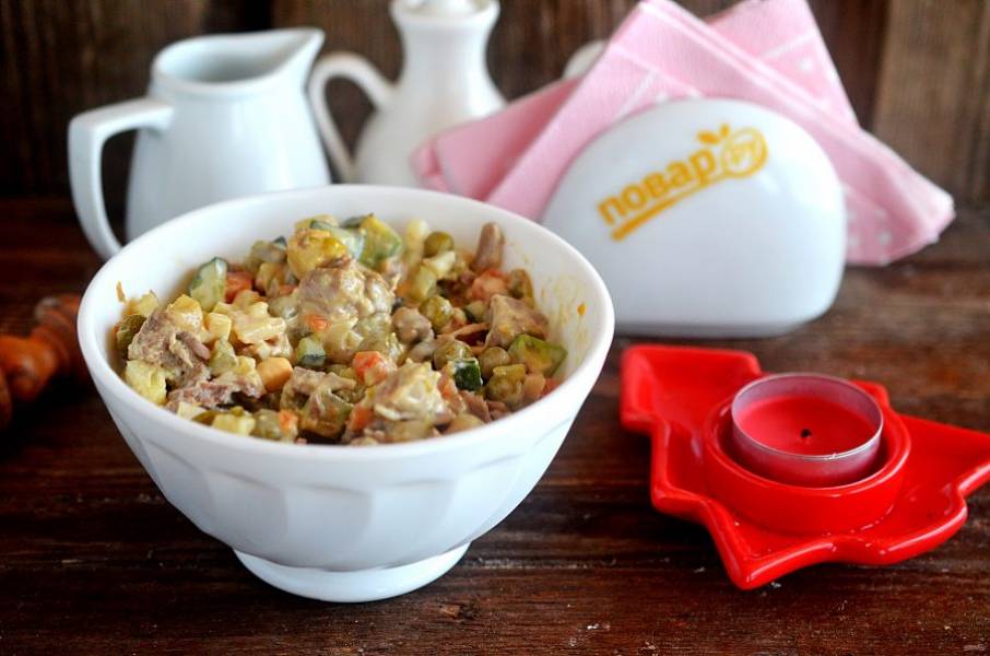 7. Все перемешайте. Добавьте горошек, майонез и подавайте к столу. Приятного аппетита!