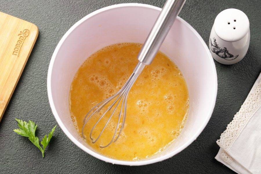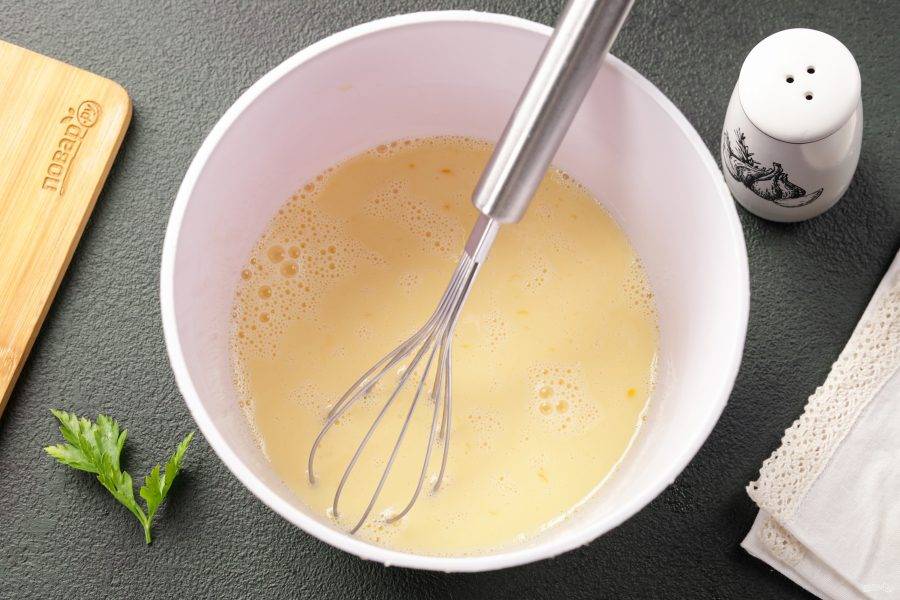 Перемешайте яйца при помощи венчика. Добавьте соль по вкусу.