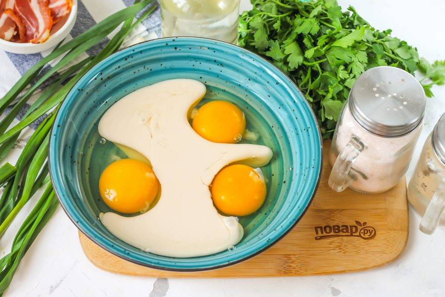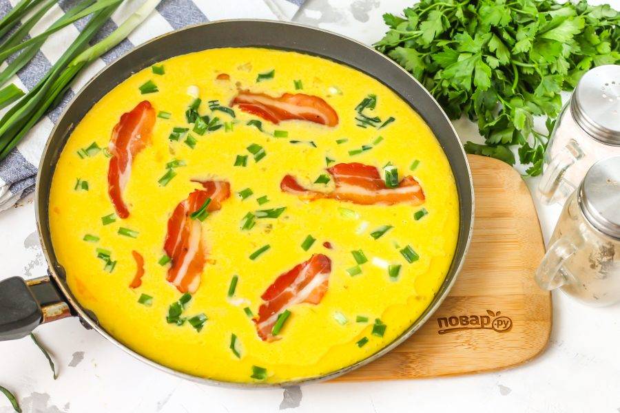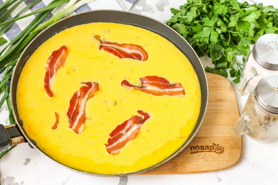 Прогрейте на сковороде растительное масло, влейте яичную массу, и сразу же выложите в нее ломтики бекона или колбасы.