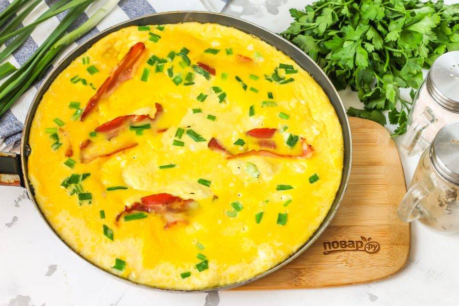 Промойте стебли зеленого лука, измельчите и присыпьте сверху омлет, пока он не застыл. Обжаривайте блюдо примерно 3-5 минут в зависимости от ширины сковороды. Если она малого диаметра, то обязательно накройте емкость крышкой и убавьте нагрев до минимального.