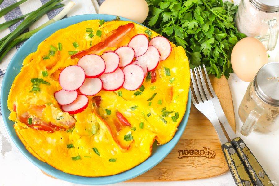 Пышный и красочный омлет можно приготовить на ряженке, добавляя в него ингредиенты по своему вкусу: бекон, колбасу, прожаренный мясной фарш, помидоры или фасоль. Подавать блюдо лучше с овощами.