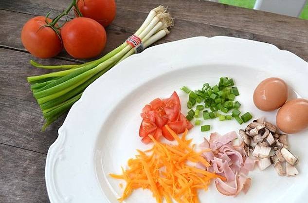 1. Рецепт приготовления омлета на сковороде знаком даже новичкам в кулинарии. Особенность этого блюда в том, что оно весьма универсально и прекрасно подходит не только для завтрака, но и для ужина. Сперва нужно подготовить все ингредиенты. Зеленый лук, помидор, грибы вымыть и просушить. Нарезать овощи и ветчину. Сыр натереть на терке.