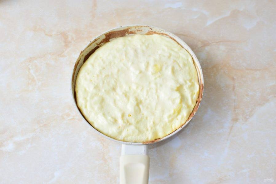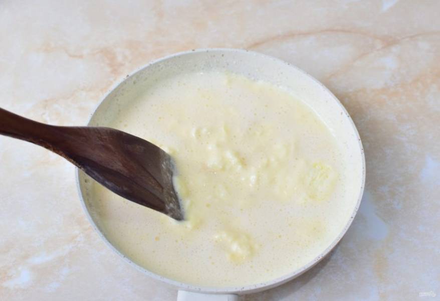Несколько раз помешайте все на сковороде. Постепенно яичная масса будет запекаться. Когда останется немного жидкости, накройте сковороду крышкой и оставьте на небольшом огне на 2-3 минуты.