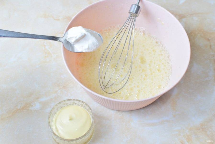 Добавьте в миску сметану и майонез. Можно добавить немного специй. Еще раз все взбейте, чтобы получить однородную консистенцию.