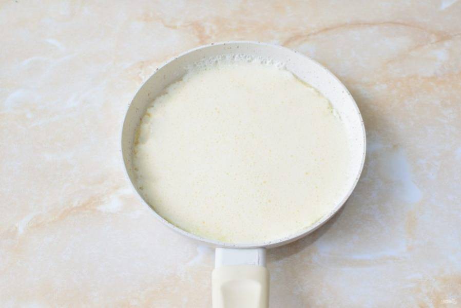 В горячую сковороду налейте немного растительного масла и вылейте взбитые яйца.