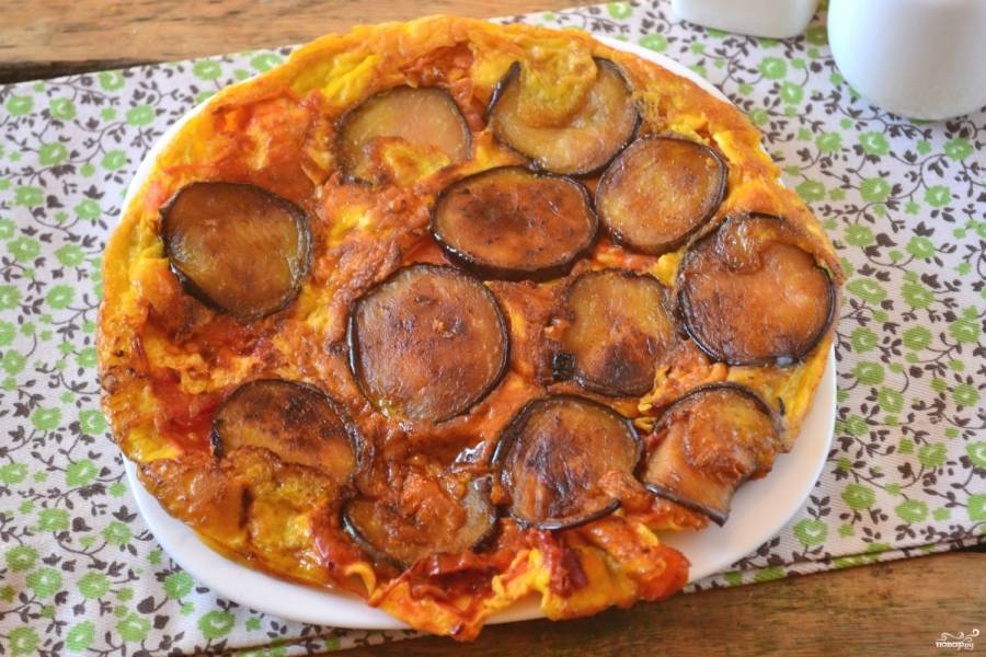 Готовый омлет выложите на тарелку, чтобы кружочки баклажанов оказались сверху. По желанию можете украсить мелко рубленной зеленью или любимым соусом. Кушайте с удовольствием!