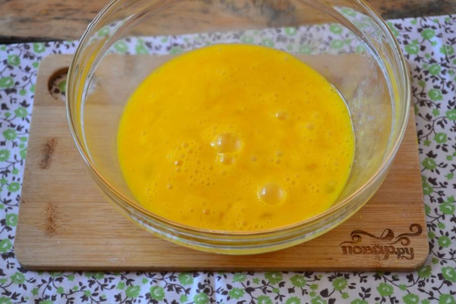 Тем временем взбейте яйца с молоком и солью, это можно делать ручным венчиком, а можно воспользоваться для этого дела миксером.