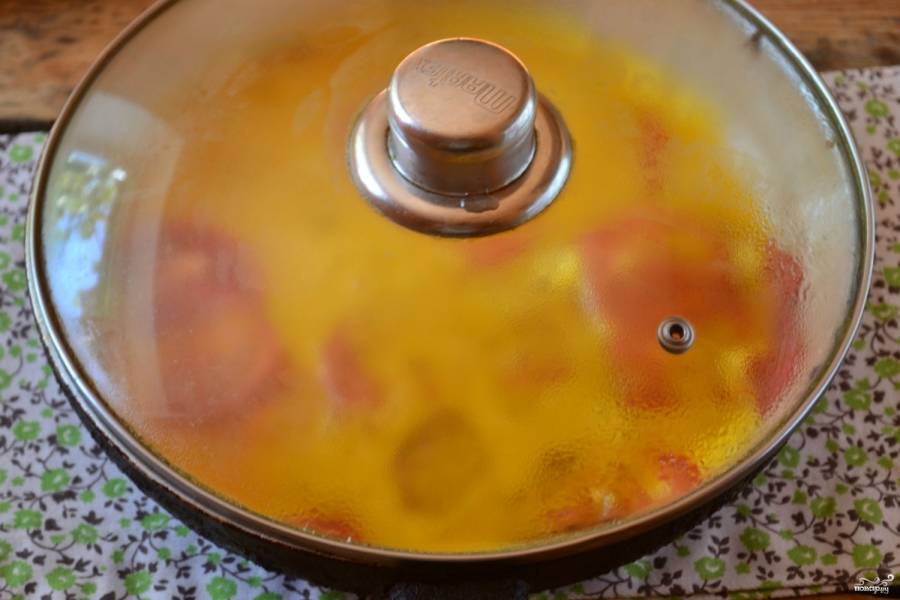 Залейте яичной смесью овощи, накройте сковороду крышкой, готовьте блюдо на медленном огне около 5 минут.