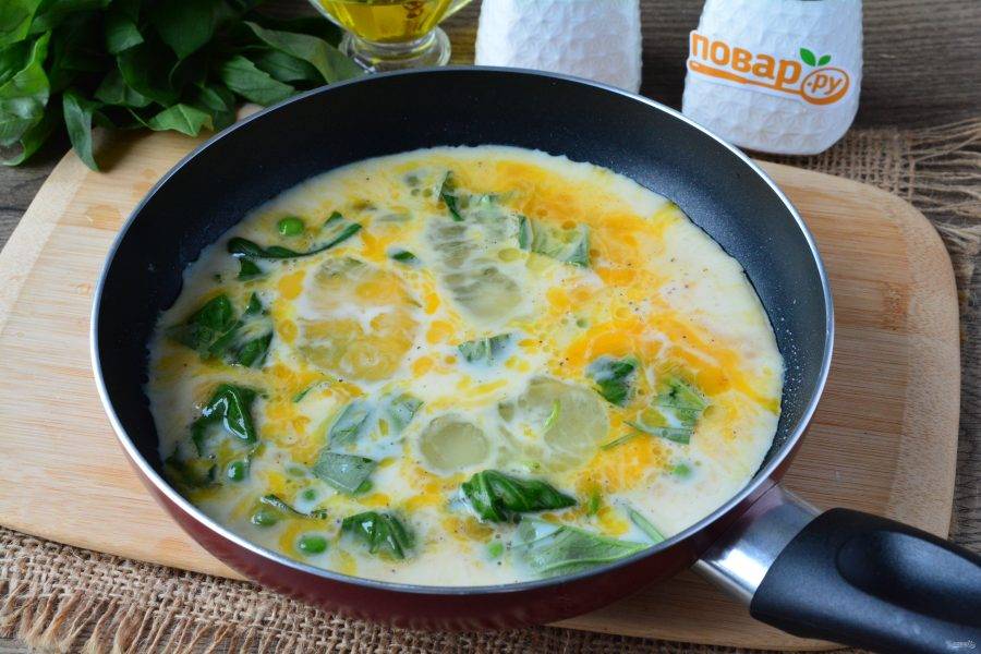 Сковороду разогрейте на небольшом огне, смажьте оливковым маслом, влейте омлет.