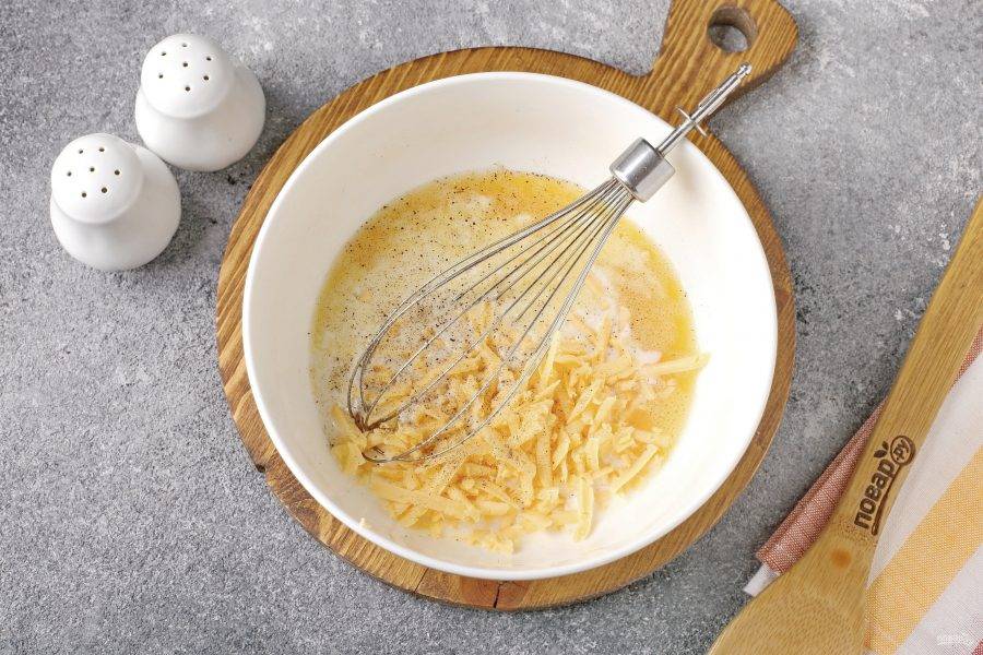 Добавьте молоко, тёртый сыр и перец по вкусу.