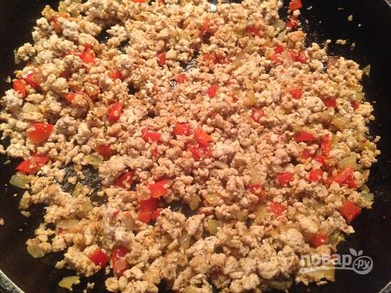 Добавим щепотку черного перца и любимую приправу для мяса, перемешаем и обжариваем до полной готовности мяса. Остужаем.