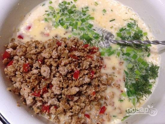 Добавляем мелко нарезанные зеленый лук с укропом, а также мясной фарш.