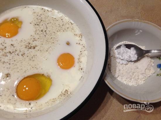 Наливаем в миску молоко, добавим яйца, соль и черный перец. Взбиваем венчиком пару минут. Смешиваем муку с крахмалом и добавляем в молочно-яичную смесь. Взбиваем до однородности.