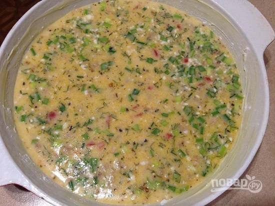 Форму для запекания смазываем сливочным маслом, выливаем омлетный полуфабрикат.