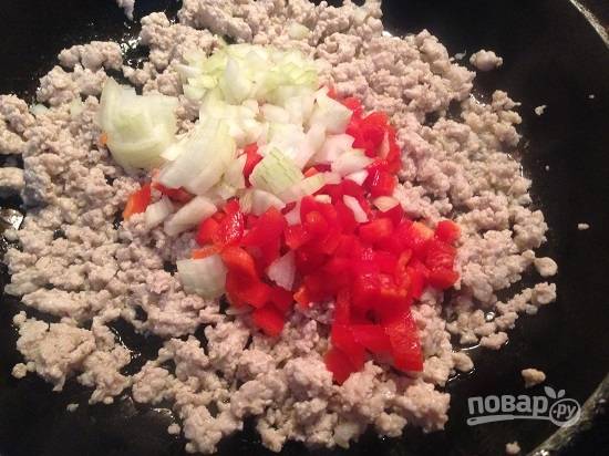 Мелко нарежем репчатый лук и болгарский перец, добавим к фаршу на сковороду. Можно немножко посолить.