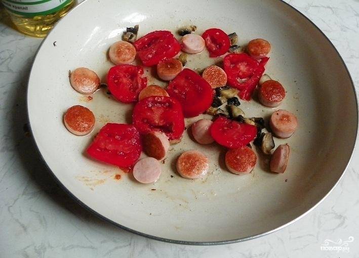 3. Помидоры помойте и нарежьте крупными кусками или кружочками. Отправьте их на сковороду. Посолите и поперчите по вкусу. Готовьте несколько минут, пока помидоры не станут мягкими.