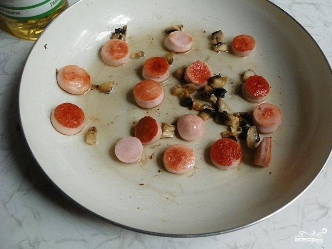 2. Шампиньоны быстро промойте в проточной воде, чтобы они меньше впитали влаги. Нарежьте грибы мелкими или средними кусочками и обжарьте вместе с сосисками на сковороде до мягкости.