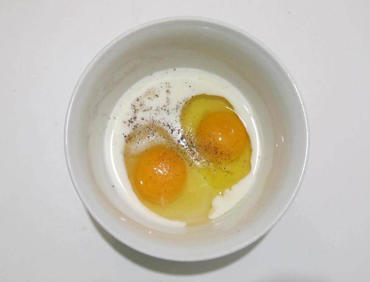 В миску разбиваем яйца, вливаем молоко, солим и перчим и хорошенько взбиваем все до образования однородной массы.
