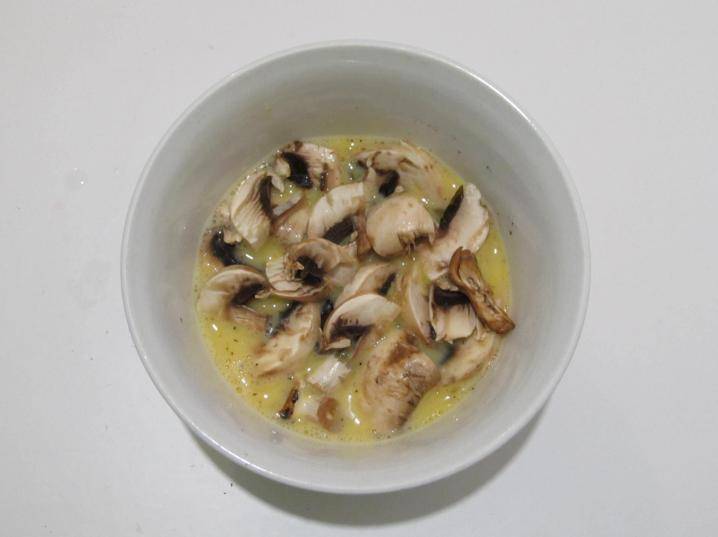 Нарезаем грибы на небольшие кусочки и выкладываем их во взбитые яйца, перемешиваем.