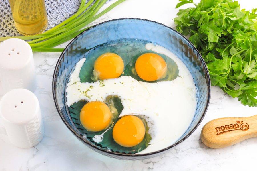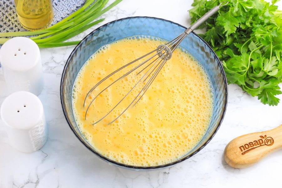 Куриные яйца вбейте в глубокую емкость и всыпьте туда же соль. Можно добавить приправы или специи по вкусу. Влейте молоко любой жирности.