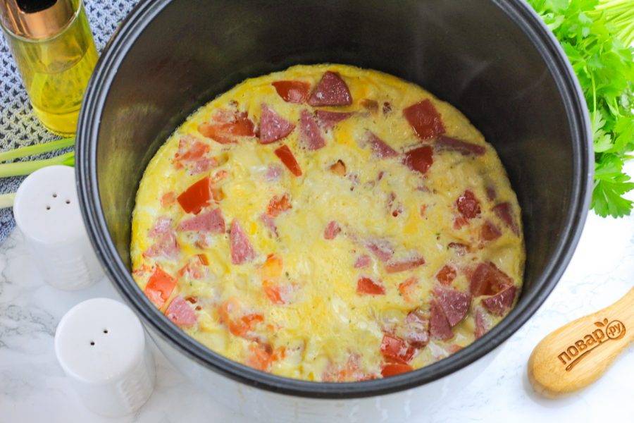 Активируйте на табло мультиварки режим "Жарка" на 10 минут и влейте в чашу растительное масло. Прогрейте его в течение 1-2 минут и влейте взбитую яичную массу. Сразу же выложите в нее нарезки и закройте крышку техники.