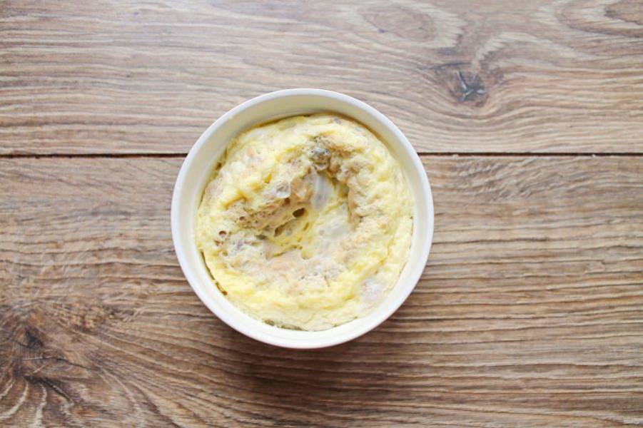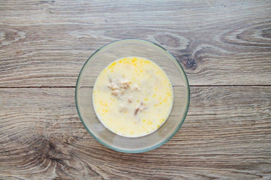 Консервированную горбушу разомните вилкой и добавьте в яичную массу, перемешайте.