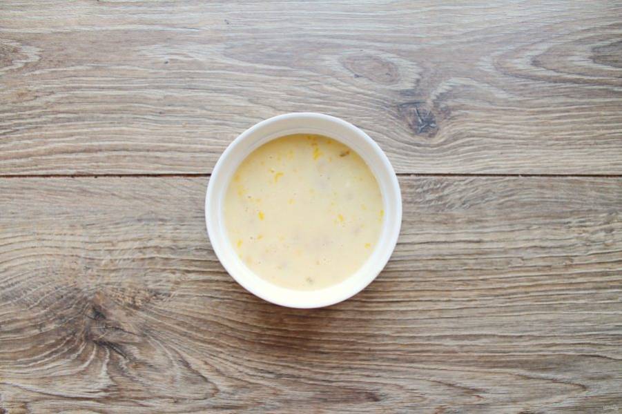 В миску налейте молоко, разбейте яйца, посолите и перемешайте.