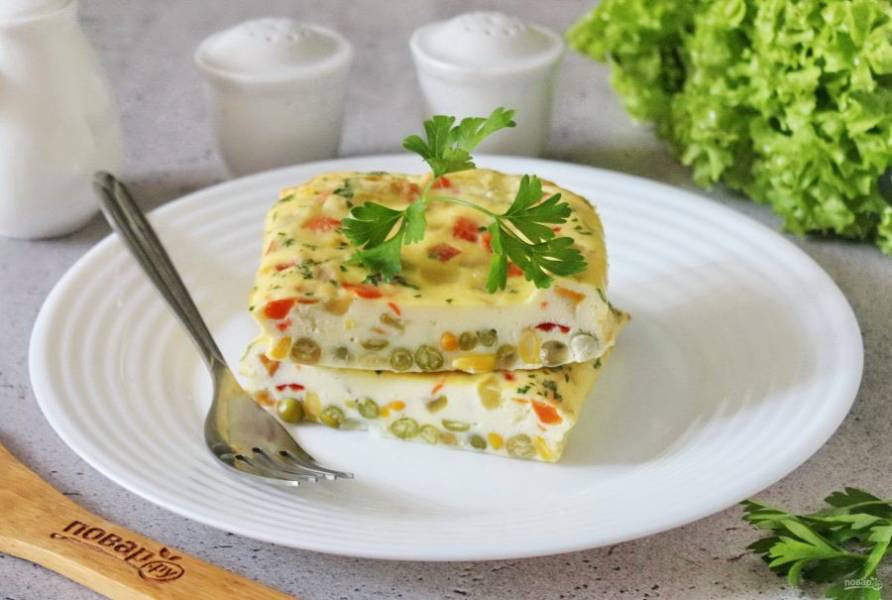 Омлет с мексиканской смесью готов. Нарежьте его и подавайте к столу. Приятного аппетита!