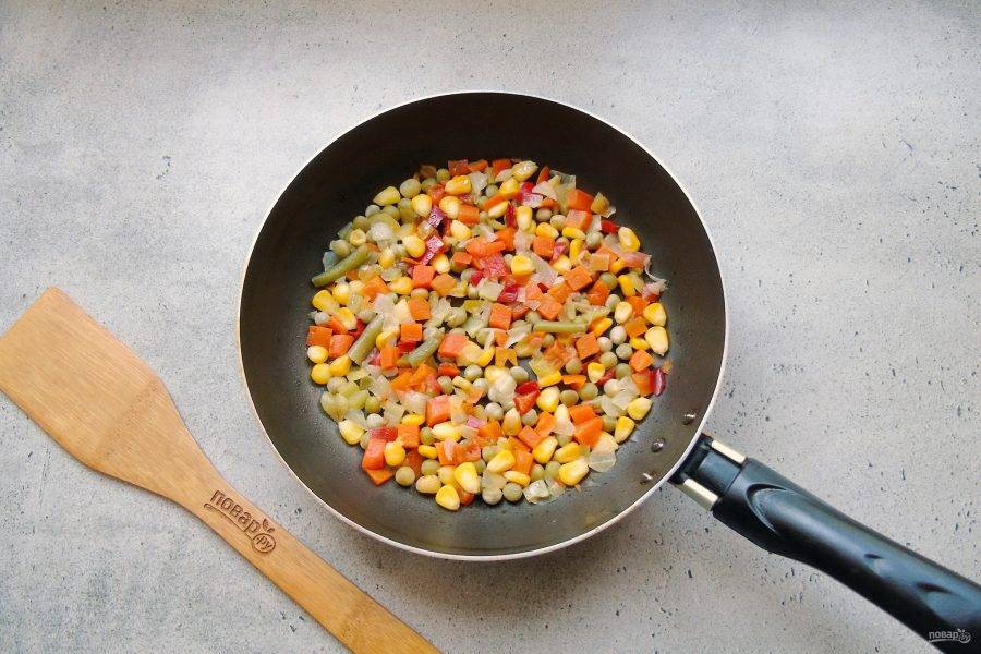 Мороженую мексиканскую смесь помойте и выложите в сковороду с подсолнечным маслом. Жарьте 8-10 минут до мягкости на небольшом огне.