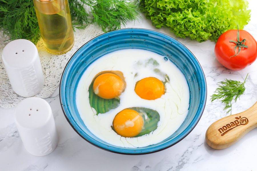 Вбейте куриные яйца в глубокую емкость и влейте молоко. Добавьте пару щепоток соли и взбейте венчиком в течение 1-2 минут. По желанию можно всыпать немного молотого черного перца.