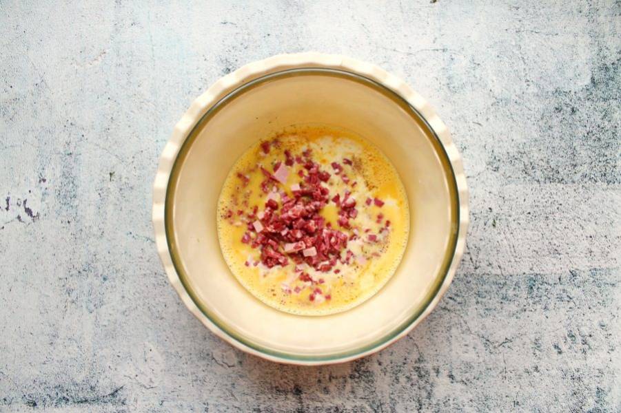 Колбасу мелко порежьте и добавьте в яичную массу.