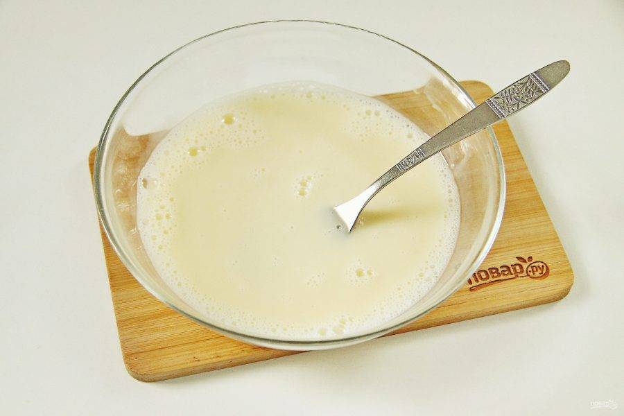 Добавьте питьевую холодную воду, молоко и взбейте все еще раз. Тарелку накройте и отправьте в микроволновку на 3-5 минут. Готовьте на максимальной мощности.