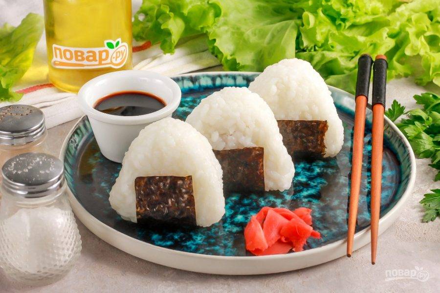 Треугольники онигири — замечательное сытное блюдо, которое может подаваться с любыми начинками. Рис для онигири не солят и не заправляют, а вот в начинку добавляют различные специи и пряности.