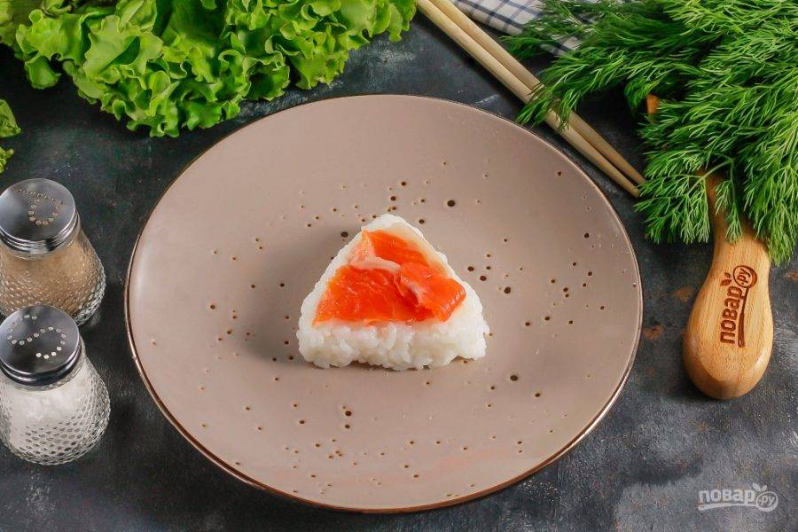 Из теплого риса вылепите треугольник и выложите на него нарезку лосося. Залепите сверху рисом, придавая форму треугольника с округлыми углами.