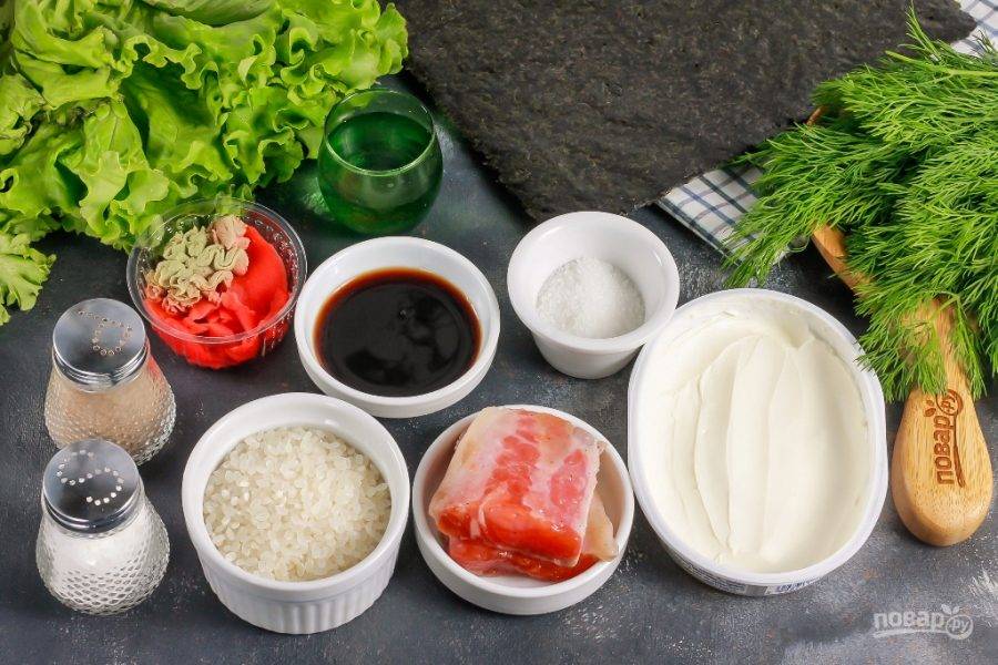 Подготовьте указанные ингредиенты. Приобретите нарезку лосося или небольшой кусочек красной рыбы и удалите с него кожу вместе с чешуей, промойте в воде. Выложите в глубокую емкость, засыпьте сахаром, солью и влейте уксус. Аккуратно помните и оставьте на 1-2 часа для маринования.