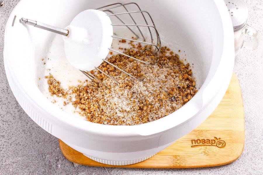 Взбейте белки в течение 3-4 минут в пышную пену на самой высокой скорости техники. Затем влейте лимонный сок и взбейте еще 1 минуту. Всыпьте в чашу ореховую крошку и аккуратно перемешайте все примерно 1 минуту на низкой скорости.