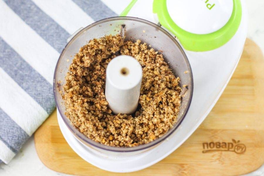 Ядра грецких орехов пробейте в измельчителе в крошку. Желательно измельчать как можно лучше, чтобы получилась ореховая мука, но если вы вдруг увидите, что масса начинает маслянеть, то выключите технику, иначе получите ореховую пасту, а не муку.