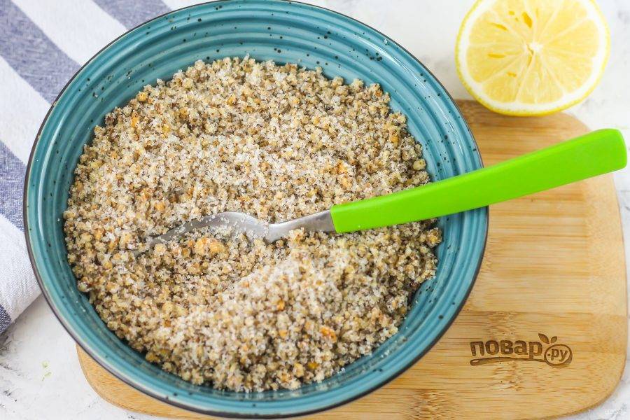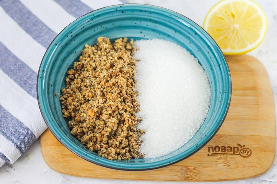 Пересыпьте ореховую крошку в глубокую емкость и туда же добавьте половину сахарного песка.