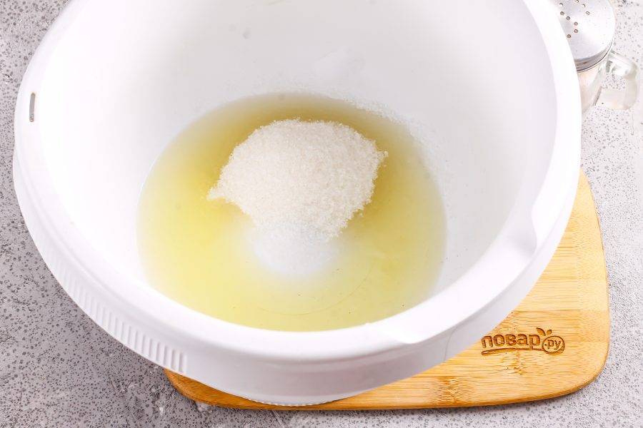 Белки куриных яиц влейте в чашу миксера или кухонного комбайна, добавьте туда же оставшийся сахар.